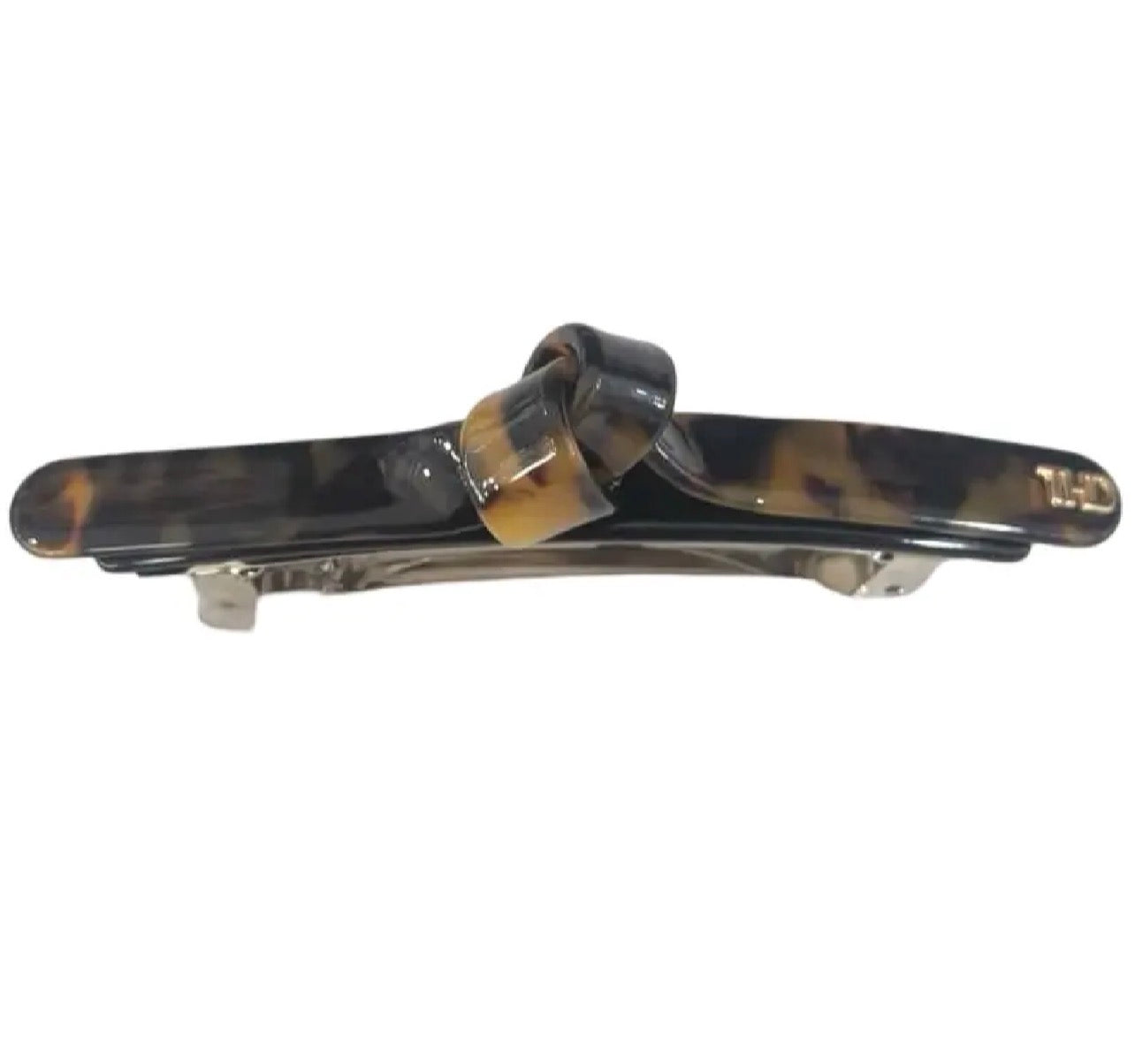 Premium Cellulose acetate contour knot on a horizontal Bar of elegant sophistication. Whether used to hold back a half up, create a side pull back design or to finish a pony , this elegant barrette will take you shopping, to the office or out for the evening