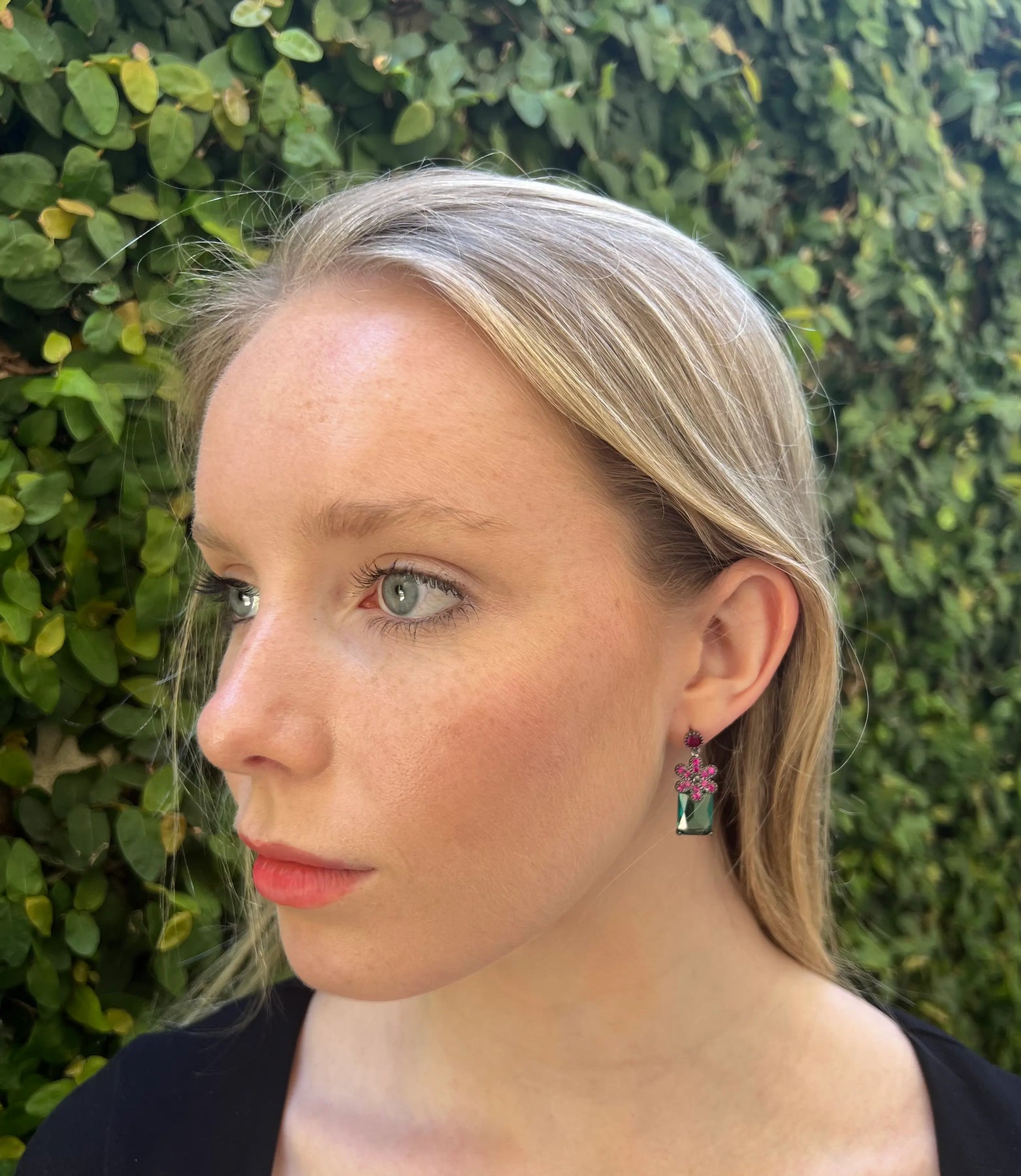 The perfect everyday pair, with a colourful pop. Hermatite metal adorned with striking purple crystals, and statement Green zirconia gems, Emerald Cut.