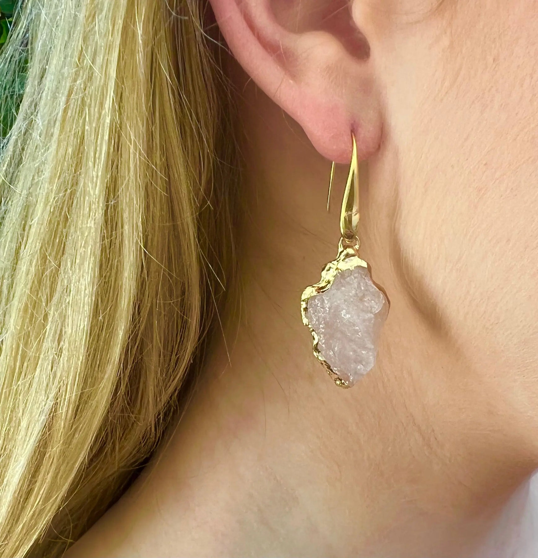 Natural True Rose Quartz uncut stones hang beautifully from gold painted sterling silver hooks, for the perfect soft bohemian statement wear.