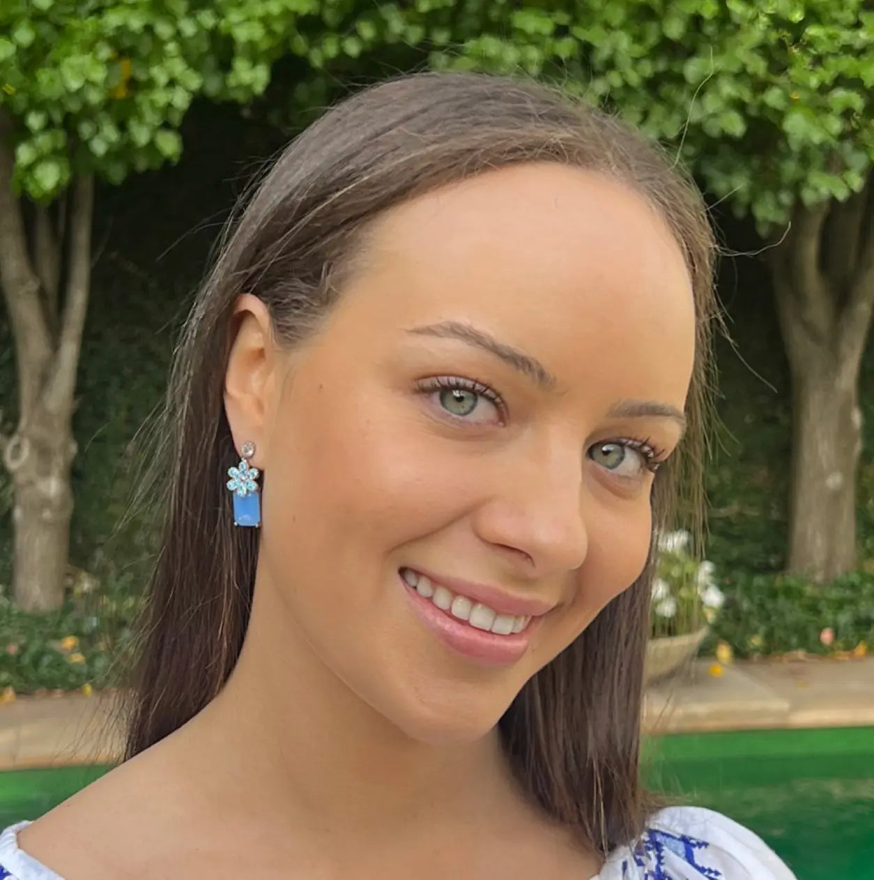 The perfect everyday pair, with a colourful pop. Silver metal adorned with striking Cornflour Blue and clear crystals, with statement Cornflour Blue zirconia gems, Emerald Cut.