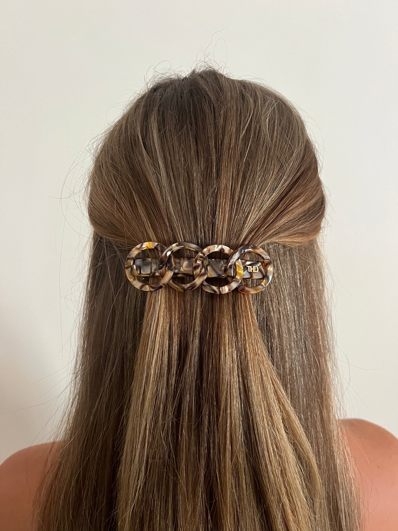 Premium Cellulose acetate interlocking rings on a horizontal Bar of elegant sophistication. Whether used to hold back a half up, create a side pull back design to finish a pony , this elegant barrette will take you shopping, to the office or out for the evening