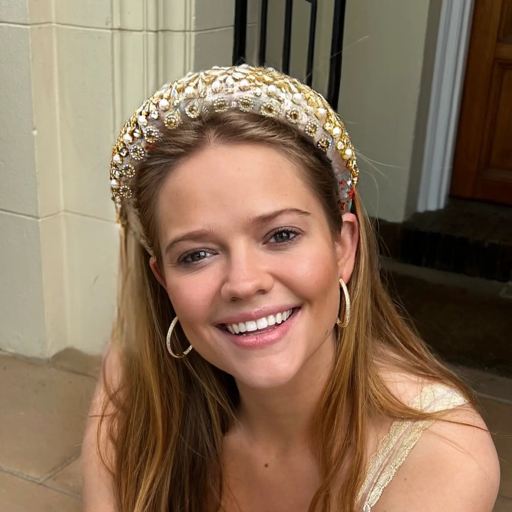 Isabella adds an instant glamour to your look with this luxurious brocade headband, sparkling with gold crystals and pearls. Perfect for elevating any outfit with a touch of bold, elegant charm.
