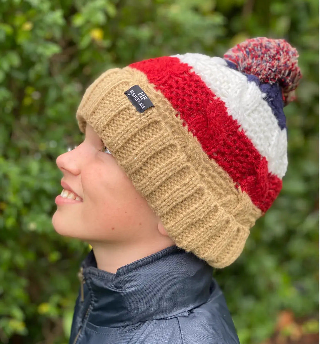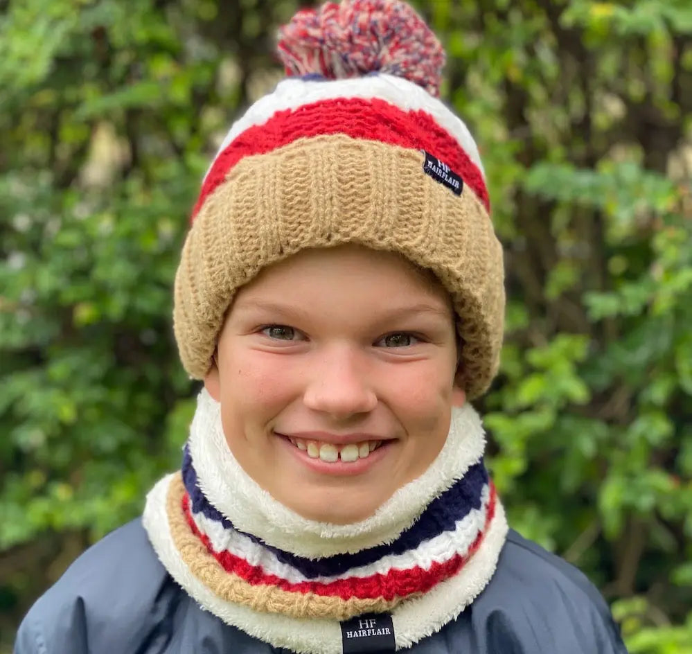 Warm knitted striped childrens Beanie with Pom Pom and scarf . Both lined with fleece - Fawn , White & Red stripe
