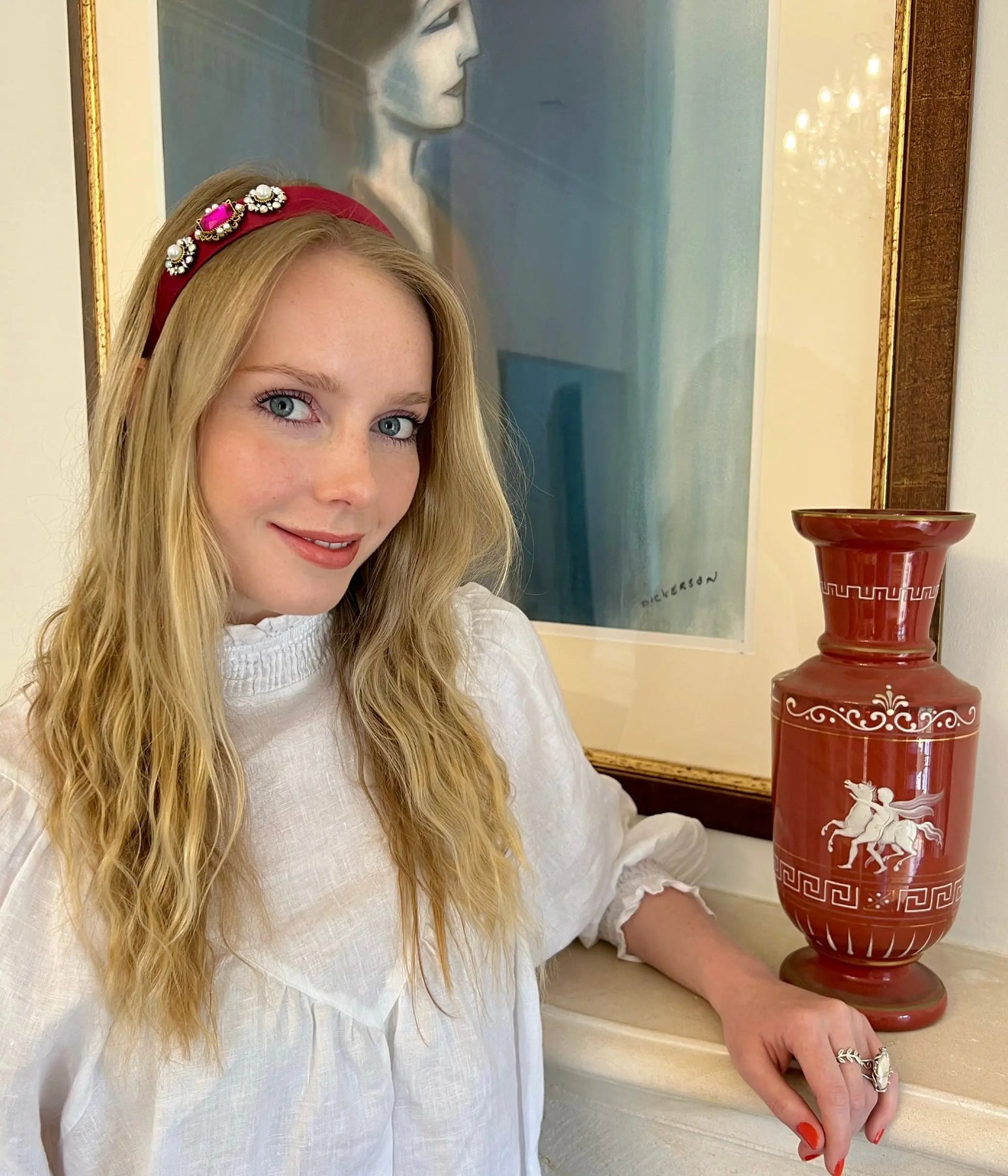 Gorgeous Red Satin band with suede lining, embellished by a modern, stunning pearl, silver and pink gem arrangement, set in Brass coloured metal.