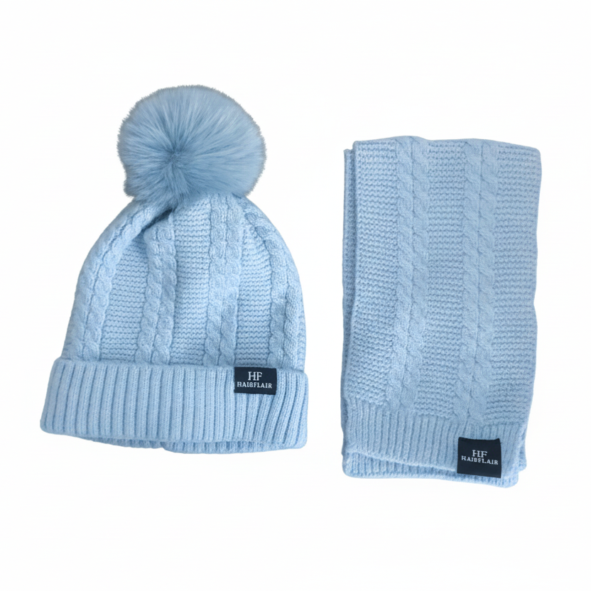 Warm knitted cable solid coloiur childrens Beanie with Pom Poim and scarf . Both lined with fleece - Blue
