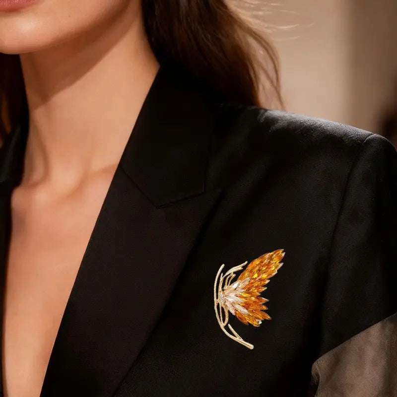 Make a statement with our stunning crystal Fire Butterfly brooch, crafted from brilliant fire toned crystals. This exquisite piece effortlessly adds sophistication and flair to any outfit, ensuring you turn heads wherever you go.