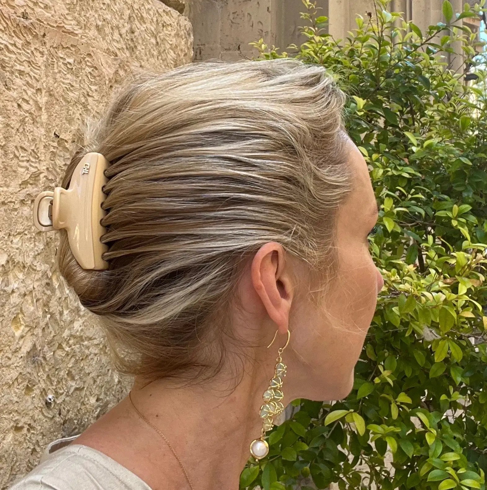 Stunning brushed metallic trim Hair Claw Clip in cellulose acetate with Nude detail to elevate your look from desk to dusk. HairFlair Aus by Tania Hird Designs uses only cellulose acetate to produce its hair claws for a glossy, stronger, more durable hair clip that is more environmentally friendly. The material derives from wood pulp and is the same durable material found in sunglass frames.
