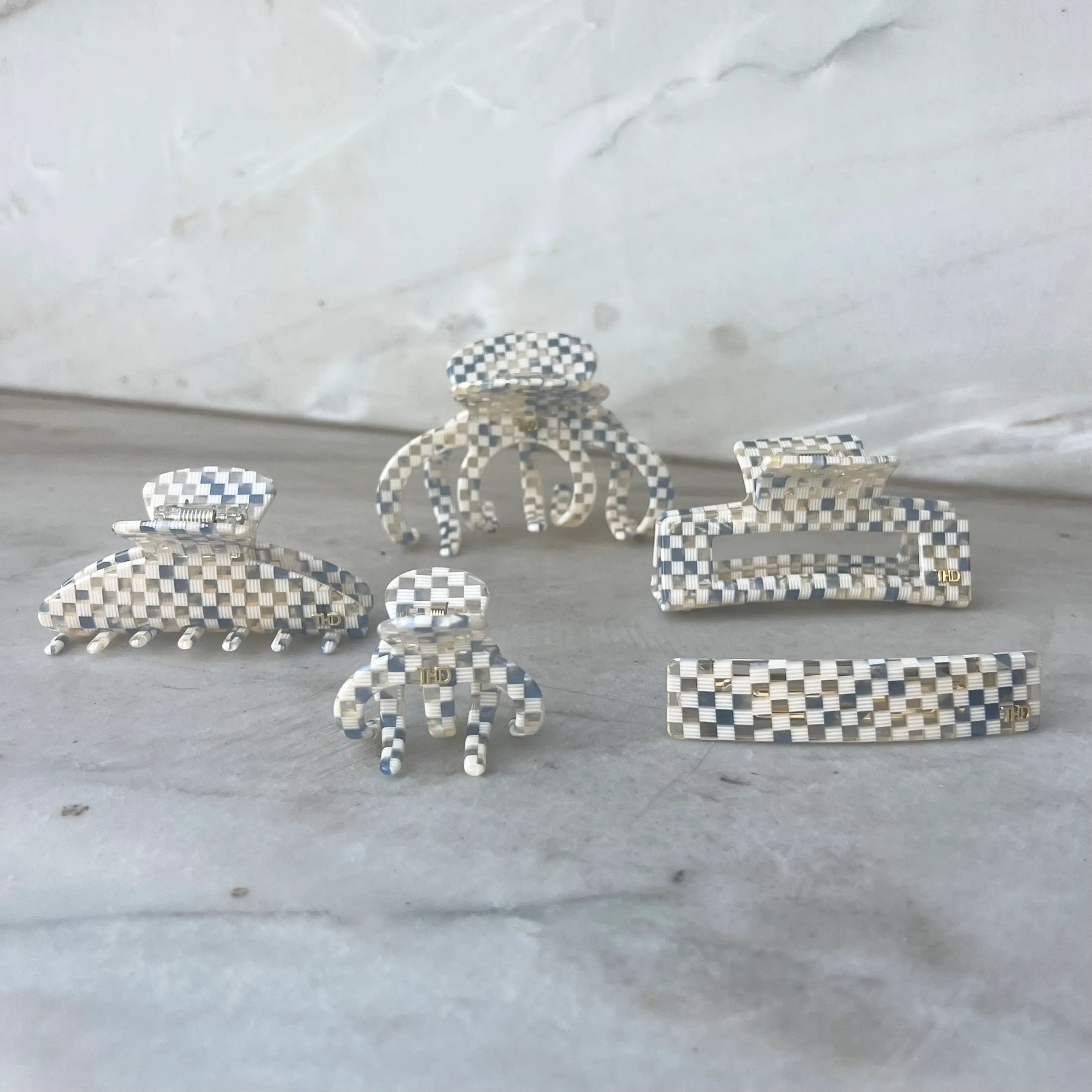 Premium Octopus Cellulose Acetate Hair claw in Blue Check Paros. A strong, durable hair claw clip for big or thick hair - 10cm x 5.5cm x 3.5cm.